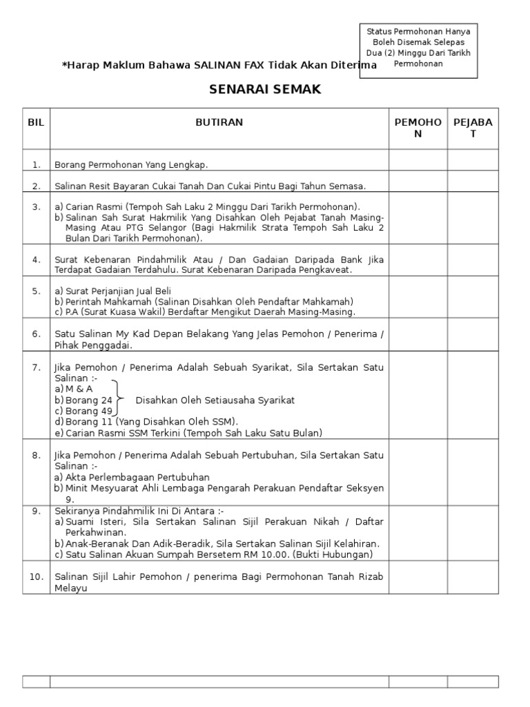 Pindahmilik Hartanah Dan Prosedur Conveyancing Oleh Peguam Hartanah Di Malaysia from tyhlawyers.my Pemilik berharap waris, penerima pusaka, pentadbir dan wasi pemilik juga perlu menghormati kebenaran ini. Pindah milik rumah hanya dibenarkan selepas 5 tahun. Bagi permohonan kebenaran pindah milik tanah pemaju kepada pembeli akhir melibatkan permohonan pelepasan lot bumiputera, jika pembeli bukan bumiputera, pemaju perlu memohon kepada pejabat setiausaha kerajaan (suk) johor bahagian perumahan untuk permohonan. Borang kebenaran boleh dimuat turun di portal rasmi polis diraja malaysia atau melalui pautan berikut sila muat turun borang permit pergerakan perintah kawalan pergerakan (pkp) atau borang permit pergerakan perintah kawalan pergerakan bersyarat (pkpb) (mengikut pelaksanaan. Ii.salinan geran hakmilik terkini,surat perjanjian jual beli atau borang 14a berserta resit bayaran di pejabat tanah & galian. Myrumah syarat syarat kebenaran pindah milik untuk hartanah negeri selangor. Kebenaran pindah milik secara menyeluruh (blanket consent). Rumah selangorku kategori a berkeluasan 700kps dengan anggaran harga jualan rm42,000 seunit.